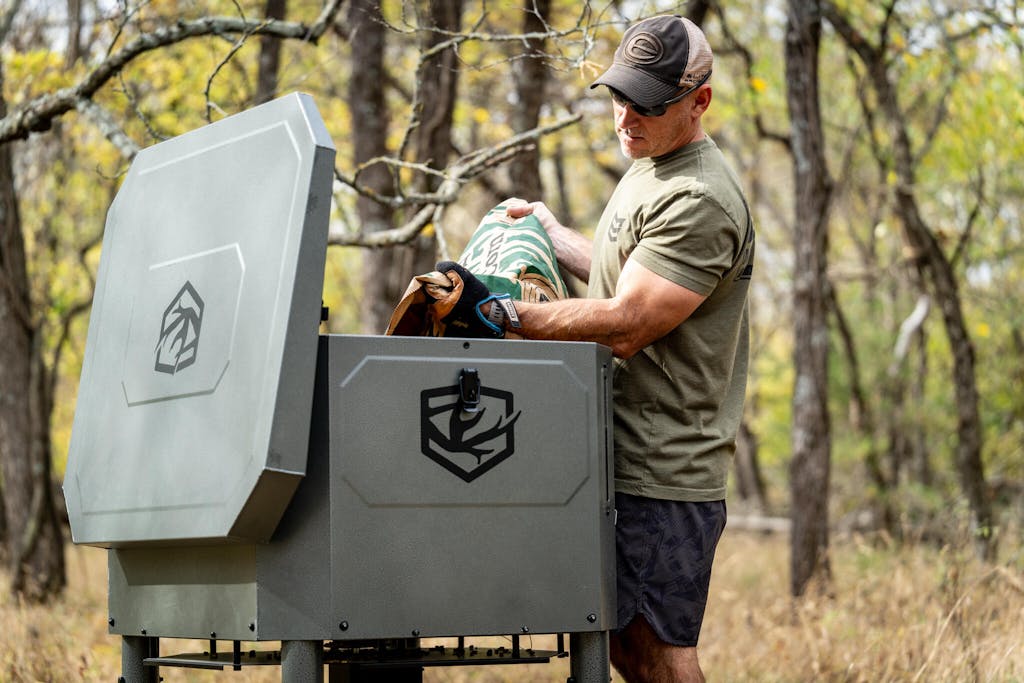 Unlike lightweight plastic feeders or elevated barrel systems, the Ritual™ is engineered from heavy-duty steel and finished with ARMOR COAT™ weatherproof protection. It features a gas-assist lid and low fill height for quick access, while enclosed 12V electronics and an HD spin motor deliver a true 360° broadcast pattern up to approximately 60 feet.